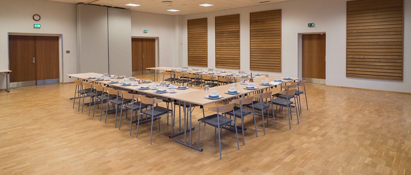 140 m² stort lyst lokale med flot udsigt. Salen kan efter behov opdeles i to rum på 70 m². Lokalet er særdeles velegnet til møder, fester o.l. Anrettekøkken med industriopvaskemaskine mv. ligger i direkte tilknytning. Service til op til 150 personer kan medfølge ved udlejning.